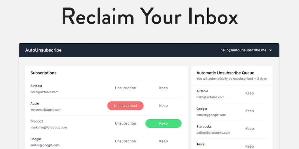 AutoUnsubscribe automatically unsubscribes you from email subscriptions that you aren't opening by going through the unsubscribe process, without you lifting a finger. Simplify and declutter your inbo