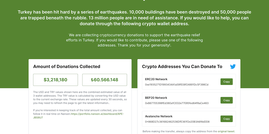 Free Discuss Collect Share Stats Any cryptocurrency can be used to contribute to Turkey Earthquake Relief Efforts. Funds will go towards helping those impacted by the disaster through trustworthy soc