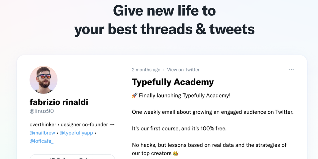 Get your free Typefully profile and give new life to your tweets and threads. Turn them into a beautiful blog automatically, and add all your links too.