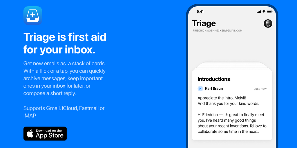 Triage is first aid for people who struggle to stay on top of their inbox. It doesn’t try to replace traditional email software, but lets you use your downtime to quickly remove the noise and stress.