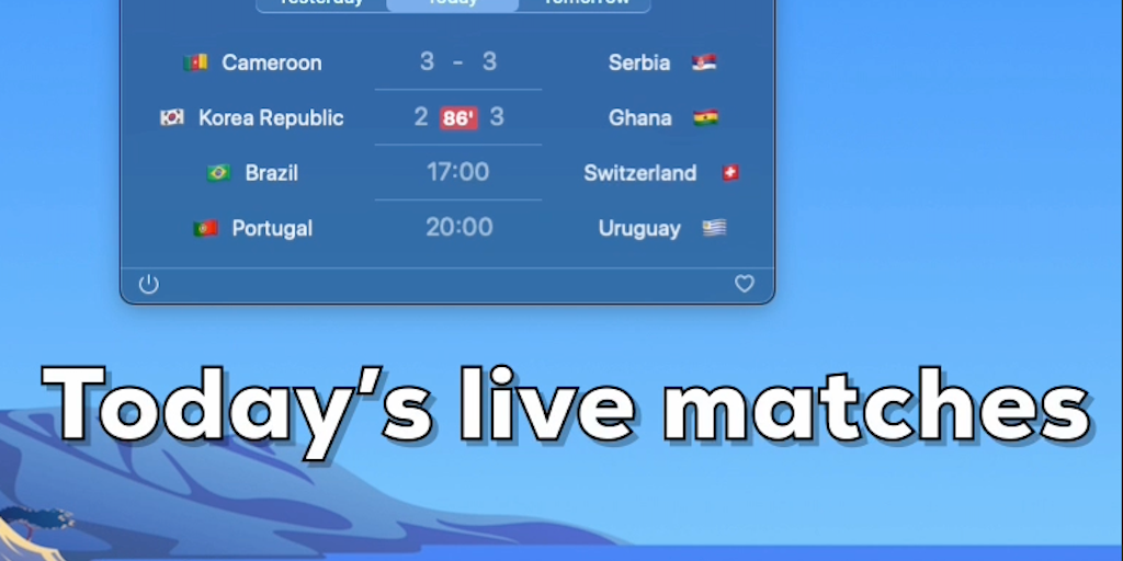 ⚽ World Cup Bar is a native Mac app living in your menu bar to easily see today's live matches (with live score!), yesterday's results if you missed it and tomorrow's scheduled matches.