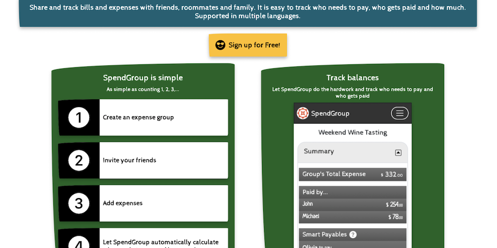 SpendGroup is a simple web app to split bills and expenses with friends, roommates and family. SpendGroup is free and allows you to create an unlimited number of expense groups and members. Supported