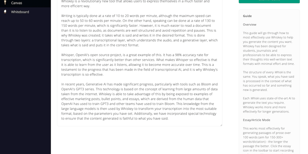 "Introducing Whiskey, the new tool that makes generating typed content faster and more efficient than ever before! With its two layers of AI, Whiskey can quickly and accurately transcribe and generate