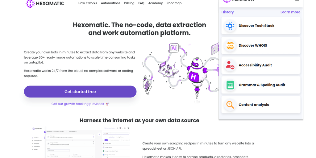 The Hexomatic extension provides 1-click access to Grammar & Spelling Audits, Accessibility Audits, Tech Stack Analyzer, Domain Whois Data, and more.