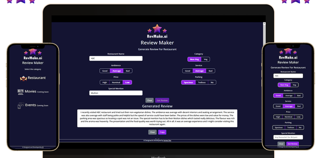 ⭐Revolutionary AI-powered review generator app for writing restaurant, movies & locations reviews 💻🛠Made using OpenAI's GPT-3 💭📝Express your thoughts & opinions with ease. Ideal for all levels of revi
