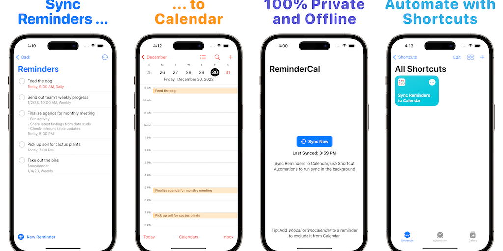Ever wanted to view your Apple Reminders natively in the Apple Calendar app? Now you can with ReminderCal. Keep using the Reminders and Calendar apps that you know and love, but with the ability to vi