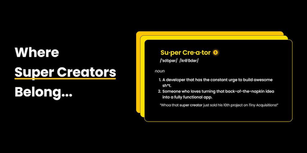 Join a prestigious group of developers all collaborating & building projects to sell on Tiny Acquisitions. Build, talk, collab in our private discord server, receive our “super creator” tag on all pro