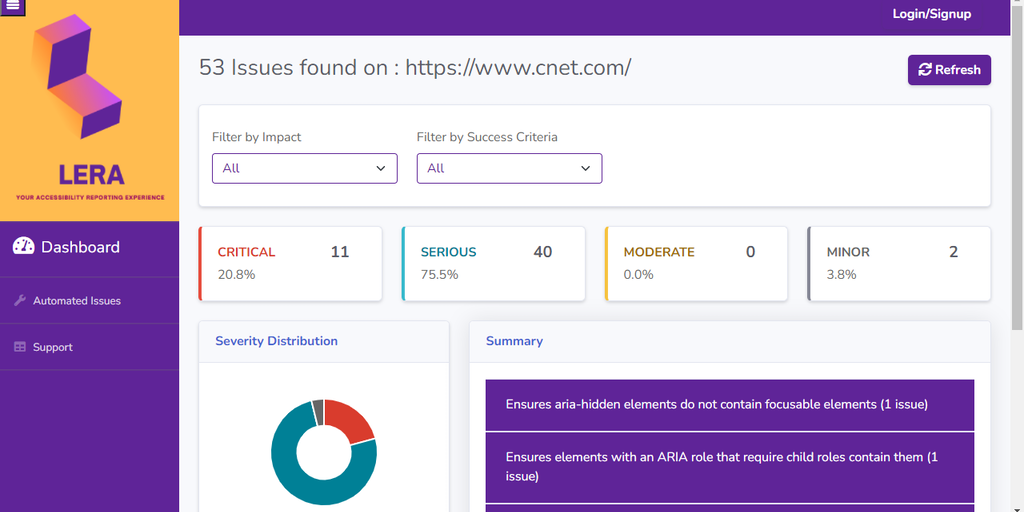 LERA is an automated Accessibility Testing and Reporting tool that provides you with granular reports of your website's Accessibility issues. It identifies automated WCAG 2.1 Level A, AA, and AAA conf