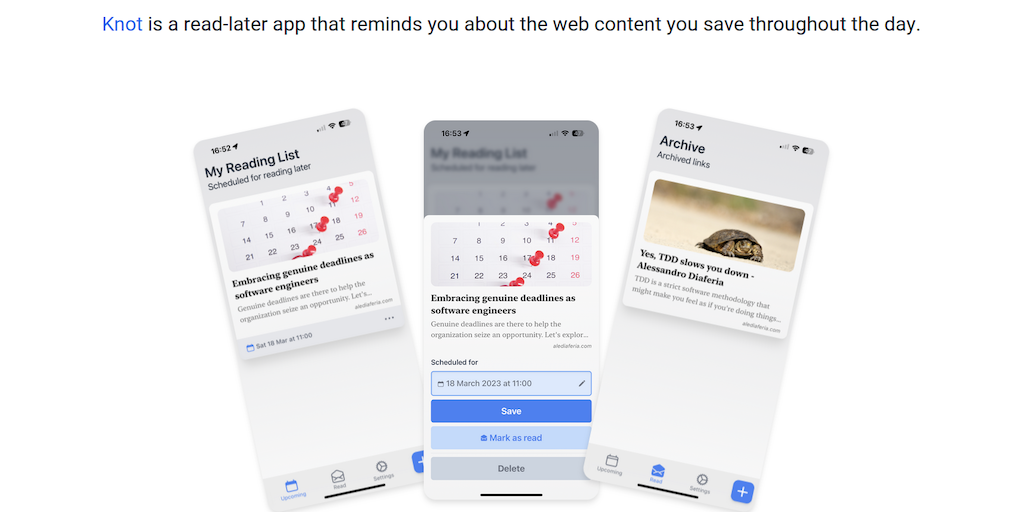 Knot - Read Later app is your bookmark for the web. Save links to read later, configure your reading schedule, and let Knot remind you. Subscription-free, with all data stored on your device. Stay pro