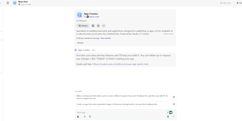 Introducing Poe Apps–easily create AI-powered visual interfaces with 100+ models! No coding needed. Use it for workflows, games, quizzes, multimedia, and more. Poe App Creator auto-generates apps from