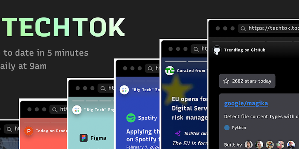 With TechTok you can get an overview in under 5 minutes from the trending repos on GitHub, Hacker News, engineering blogs from leading tech companies, Reddit, and more. Sign up for FREE to see all sum