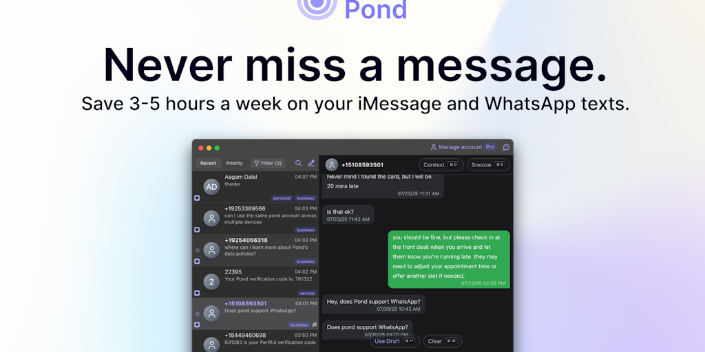 Pond is an AI-native messaging app (iMessage, WhatsApp). Solopreneurs, executives, salespeople, real estate agents and others use Pond to read and send texts at lightning speed.