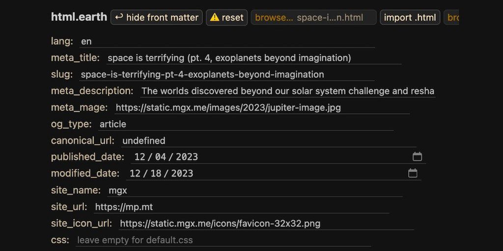 html.earth is a tiny site generator that converts Markdown input to HTML pages. It comes with a front matter editor, custom styling field, and import & export options.