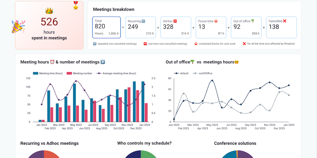 Meet Free Calendar Dashboard empowered by Coupler.io that displays all your Google Calendar insights. Check and filter your focus time, meetings, vacations, meeting organizers, and other events. It's