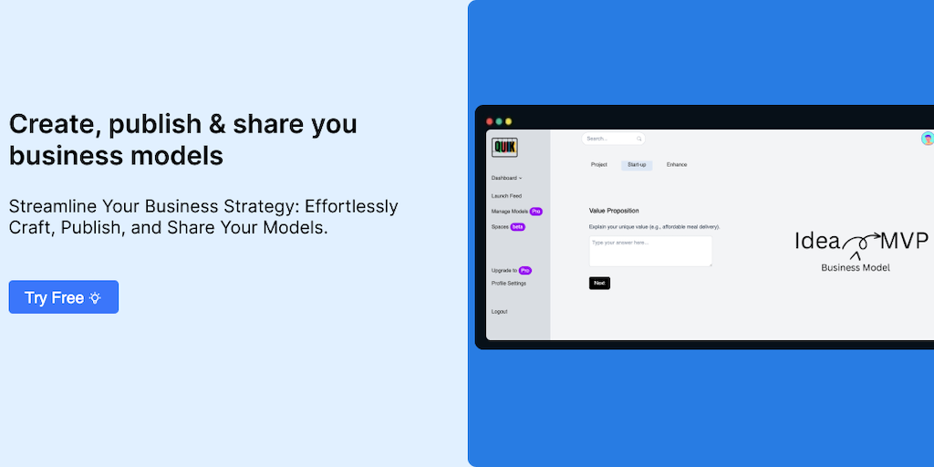 Quik MVP makes starting a business easy! Use our Lean Canvas model to bring ideas to life. Track progress and important numbers with simple tools. Start your business journey with Quik MVP—try it now