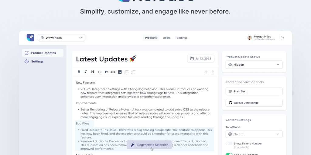 Releaso streamlines the entire process, from gathering data to crafting beautiful product updates. Save time, eliminate manual efforts, and maintain a consistent brand tone effortlessly. Join us on th