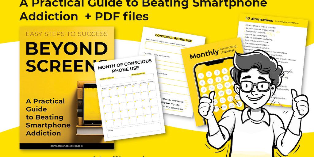Detailed guide to overcoming smartphone addiction, monthly trackers, a planner for staying on course, a list of 50 alternative activities, and inspiring phone wallpapers with affirmations.