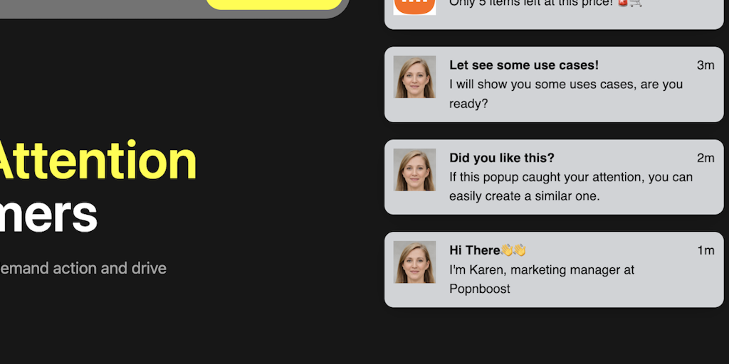 PopNBoost grabs visitors' attention with MacOS-style notifications. Customize icons and texts, set display duration, and sequence multiple alerts. Easy setup, no coding needed, compatible with all pla