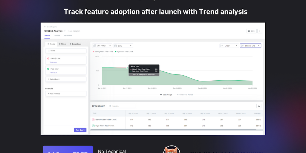 Supercharge your product growth with actionable insights from Trend analysis 📈, spot drop-offs and improve trial-to-paid conversion rate with Funnels 🌪️, and understand the impact of Cohort Analysis 👨