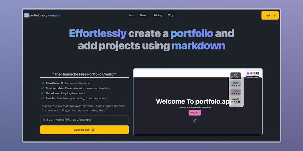 portfolo.app is a simple app for creating resumes and blogs using Markdown. I built it for anyone who has ever felt overwhelmed by the process of building a portfolio or just doesn't have the time to
