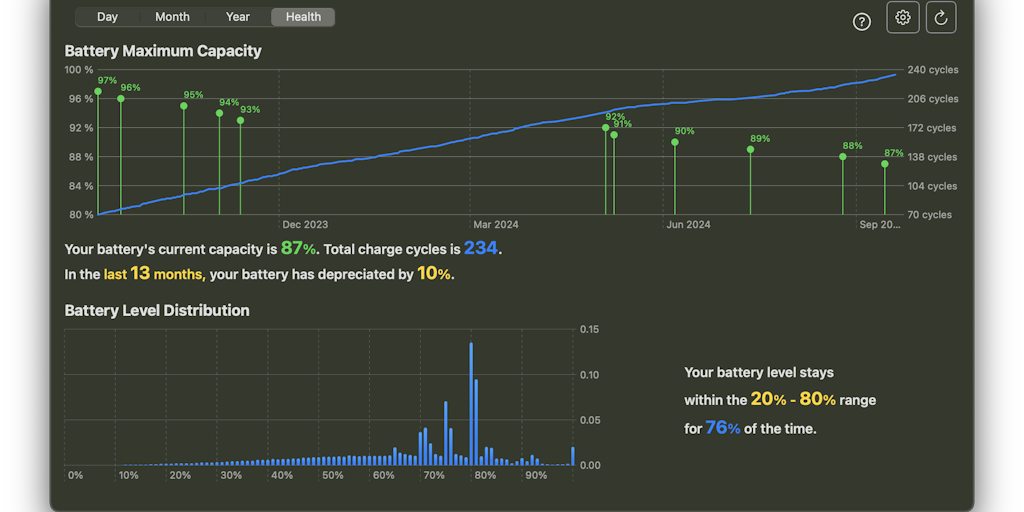 Visualize mac's battey usage and battery health using different charts. Battery levels, consumption rates, maximum capcity, level distribution... All presented to you on different time scales so you c