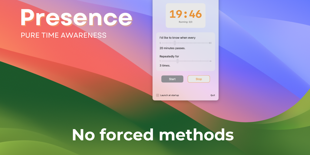 Presence is a menu bar application designed to enhance your awareness of the passing time. Unlike other productivity tools, it does not enforce specific breaks or focus periods, offering a more flexib