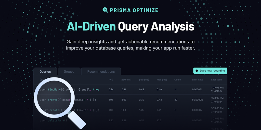 Prisma Optimize is a tool which integrates directly into your existing Prisma ORM client, measures the performance of database queries, and then shows you how to optimize with actionable tips, and an