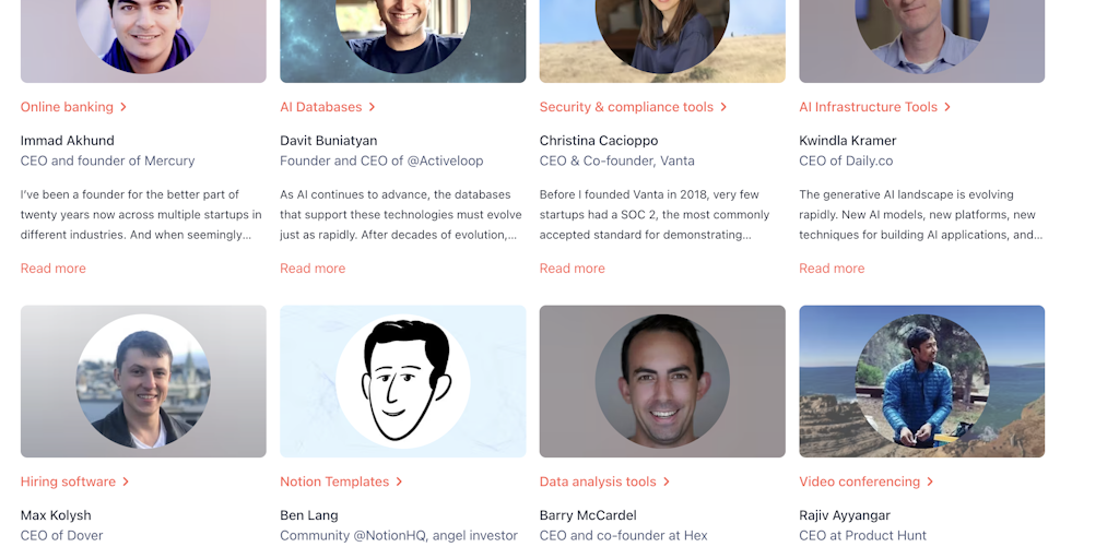 We're launching a new set of product category pages, which combine our Shoutouts data (which products are loved by the top builders) and Product Landscape articles written by top founders who are expe