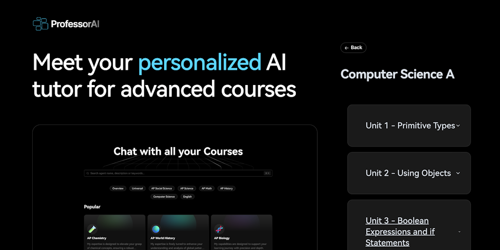 ProfessorAI is the personalized AI tutor for standardized tests. Our startup addresses the issues of expensive tutors and ineffective comprehension of course material through a custom chatbot and libr