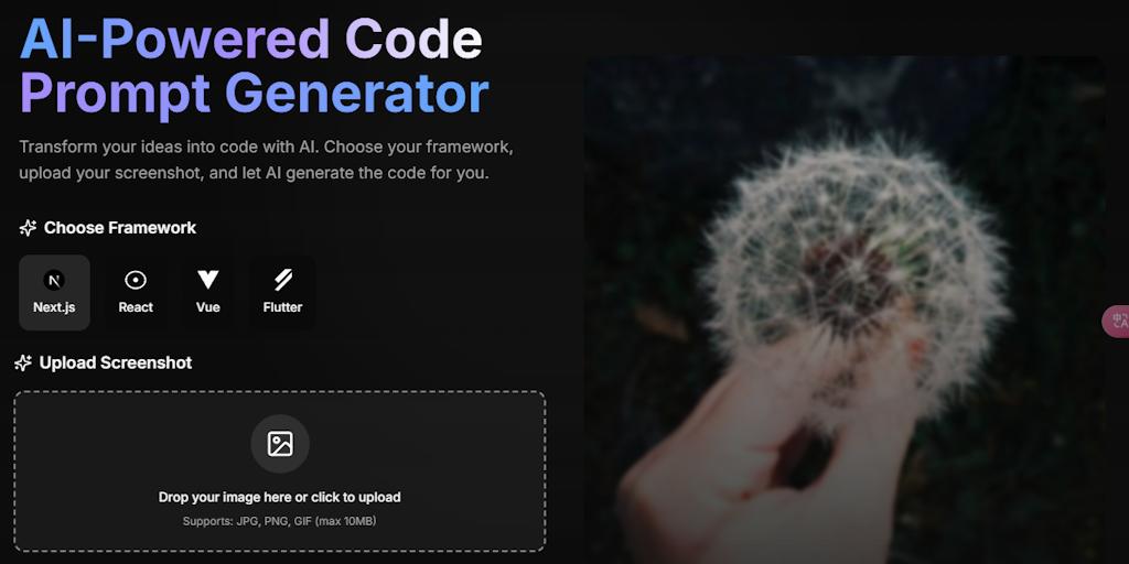 Transform your ideas into code with AI. Turn any screenshot into prompt, connect with Supabase and Perfect for AI editor like Cursor, Bolt, V0.dev and Windsurf.