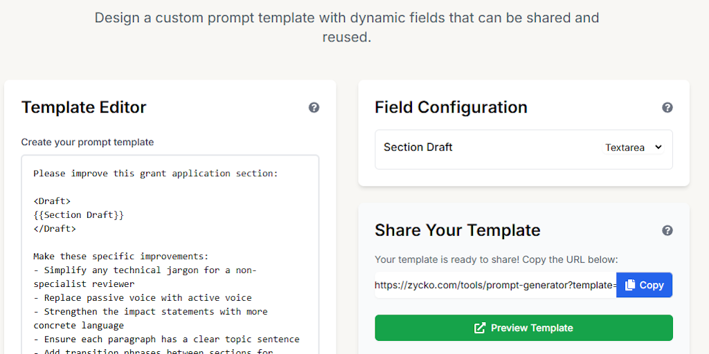 Turn your AI prompts into customizable templates that anyone can use. Simply mark the fields users should fill in, share a link, and they'll get an easy to use form which creates a perfectly formatted