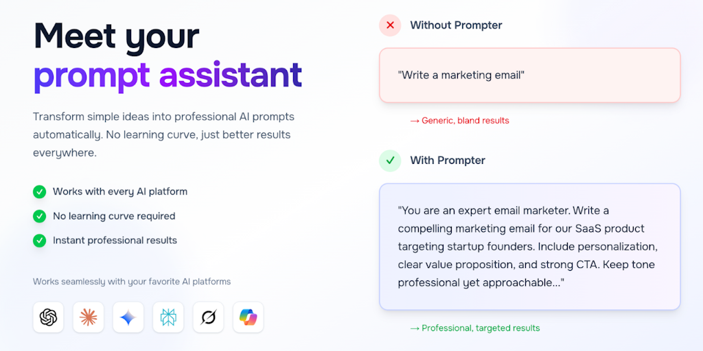Prompter is a browser extension that rewrites your prompts with your goals, tone, and project details baked in. Instantly turn rough ideas into context rich prompts that deliver actionable results fro