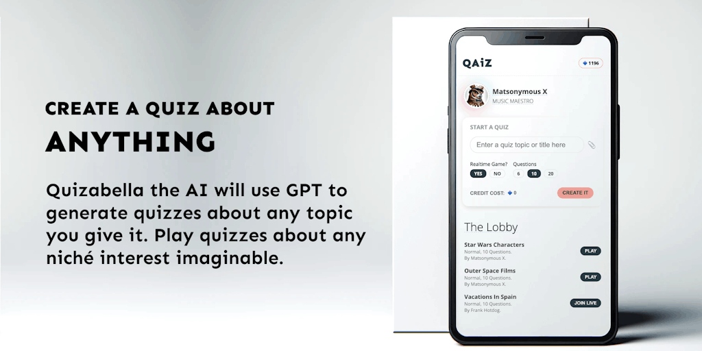 Qaiz uses GPT to generate trivia quizzes instantly on any topic, enabling live competition among friends, family and students. It features engaging live commentary and offers awards for winners, makin