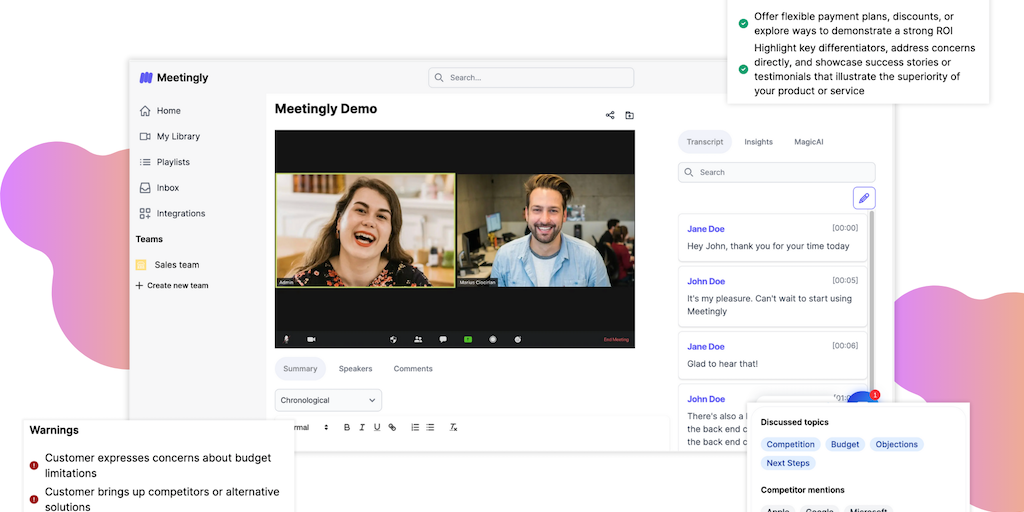Meetingly is a conversation intelligence tool that lets professionals and salespersons transcribe, summarize, and extract insights from their sales meetings. Extract buying signals, detect prospect se