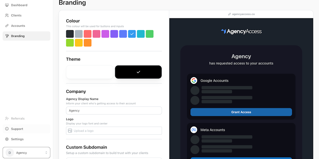 Streamline client onboarding effortlessly. AgencyAccess simplifies access to client accounts, enhancing professionalism with branded experiences.