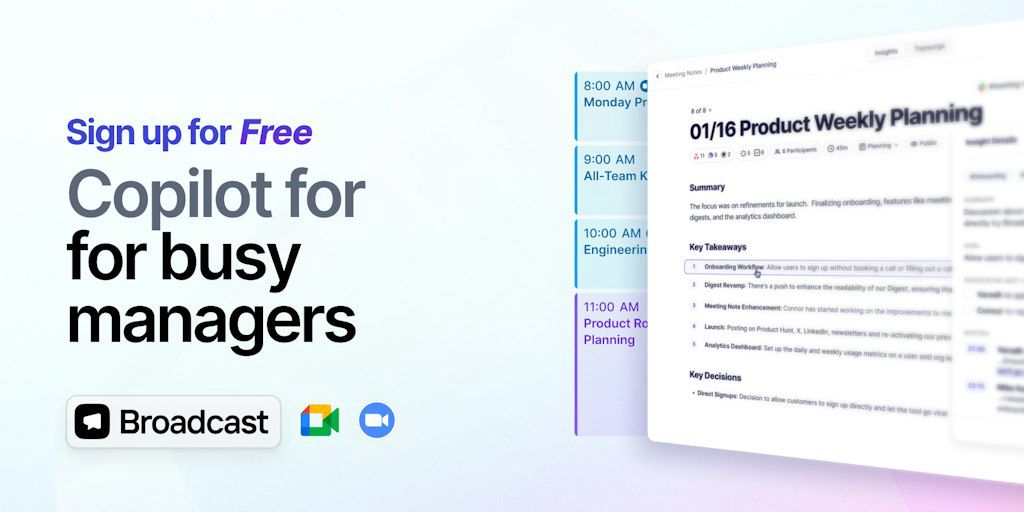 Broadcast is a manager’s copilot. It captures notes, tracks decisions, and automates actions, enabling managers to lead without busy work. Sign up for free!
