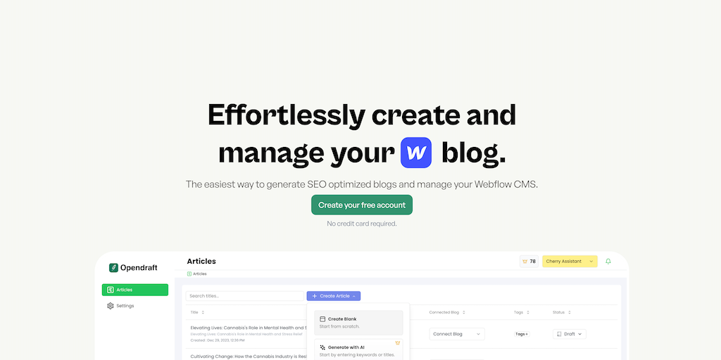 Opendraft simplifies SEO for Webflow and Shopify websites. Utilize our AI-powered blog editor, which syncs with your site, to instantly create SEO-optimized articles. Easily manage and schedule posts