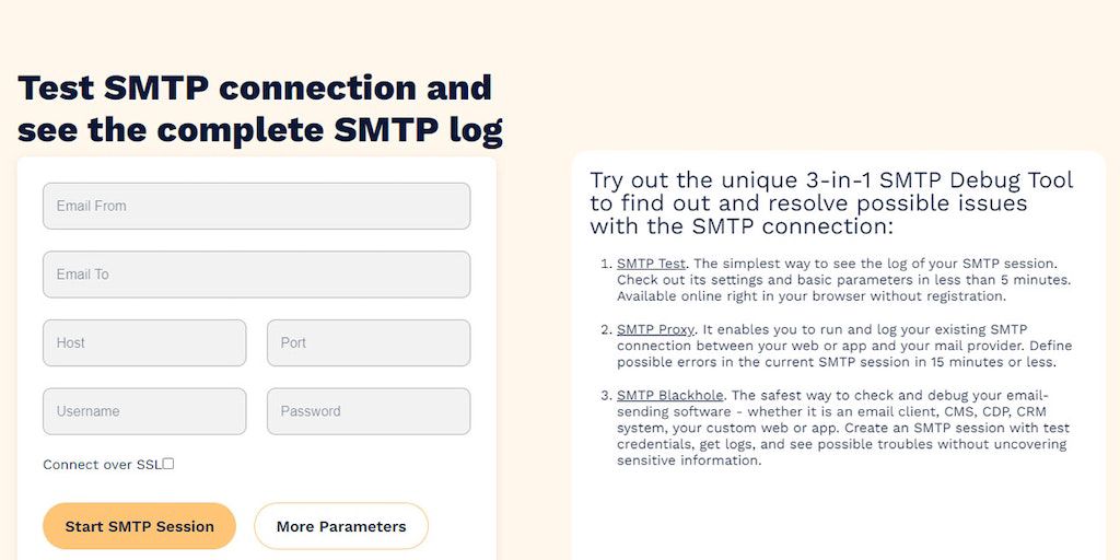 SMTP Debug Tool is an accessible technology tool for developers, maintainers, and owners of websites and apps to check the SMTP connection and see full logs of the session online. Available for free o