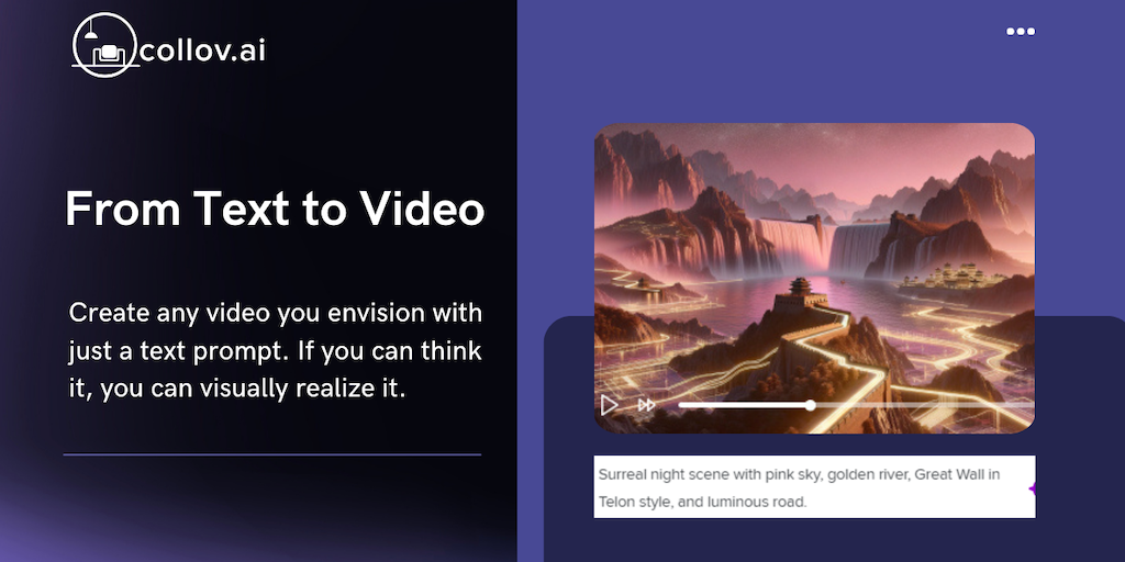 AI-video generator from Collov AI turns texts and images into mesmerizing videos, effortlessly weaving your ideas into captivating visual stories.
