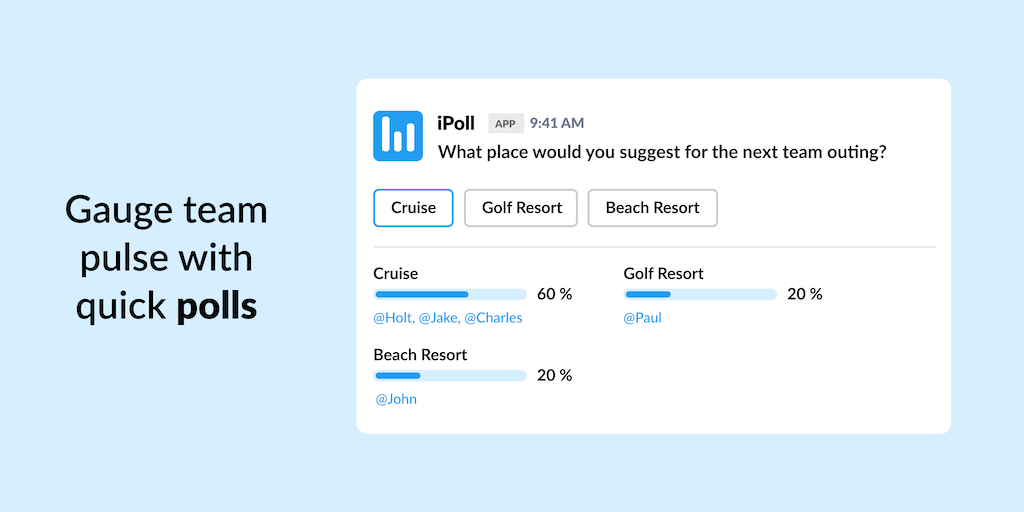 🚀 Elevate your Slack experience with iPoll! Seamlessly integrate polls, stand ups, and more. Effortless, real-time collaboration. Join the iPoll revolution! #Productivity #Collaboration #SlackPolls