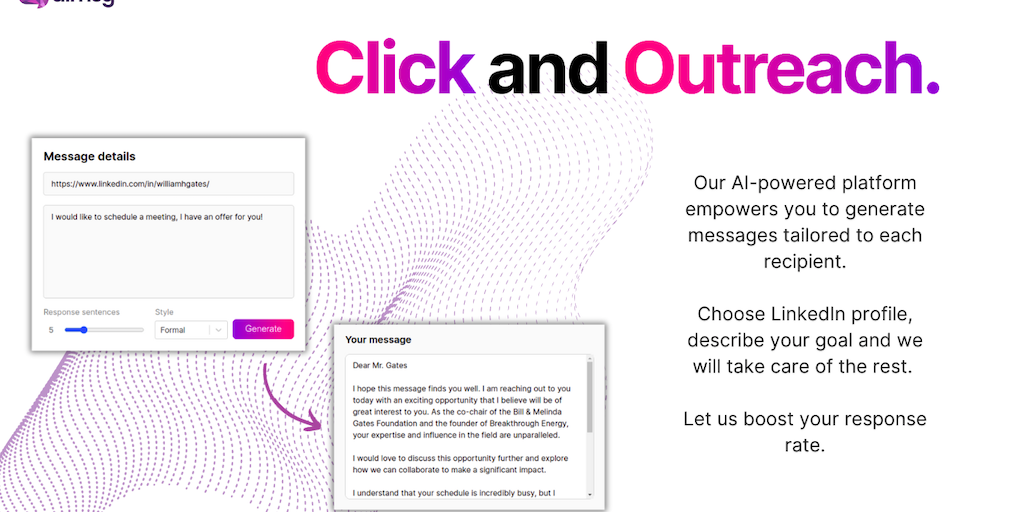 Empower your outreach with aimsg! Create messages tailored to each recipient based on their LinkedIn profile. Experience a new level of engagement and connection. Let us boost your response rate.