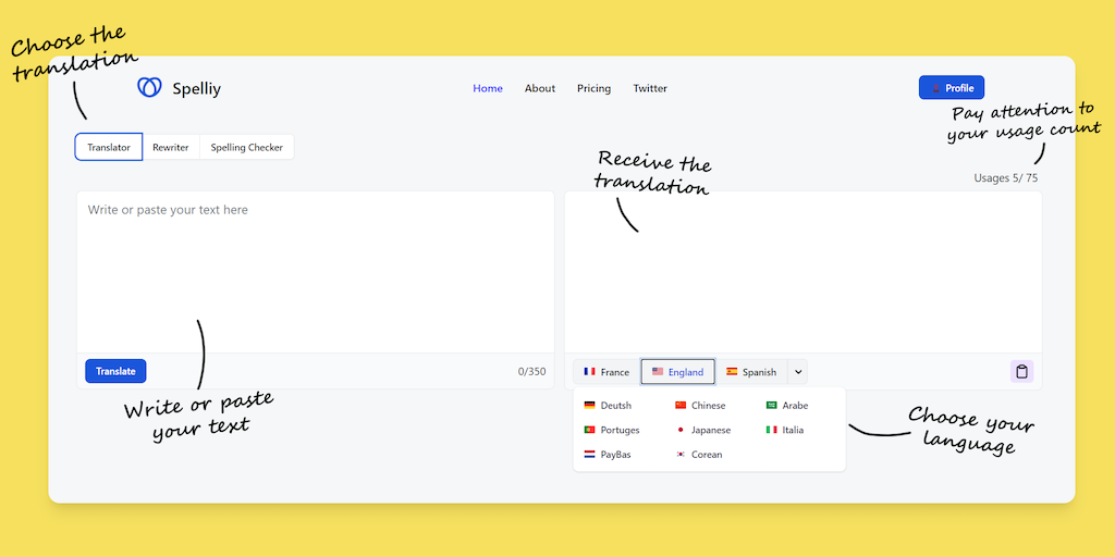 Discover Spelliy 🌐, the ultimate online tool for effortless translation, sentence correction, and creative rephrasing. No registration or credit card required! 🚫💳