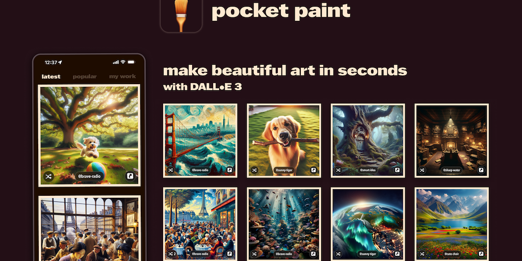 Meet Pocket Paint, the easiest way to create art from your phone with the help of generative AI. Now with DALL•E 3. No experience required. You can start by using one of our prompts or write your own.