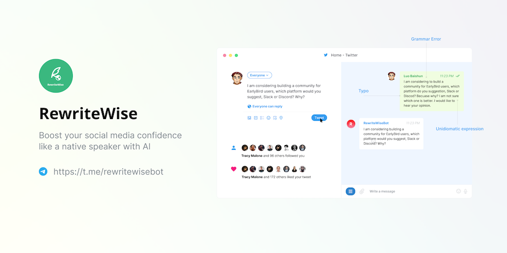 Powered by AI, RewriteWise is a Telegram bot designed to help non-native speakers improve their social media presence by proofreading, rewriting, and optimizing their posts as if they were written by