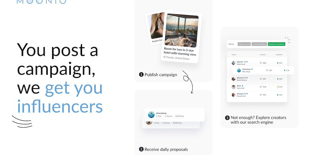 Nobody loves tedious influencer discovery—but you'll love when influencers reach out to you. Moonio makes it happen. Launch influencer marketing campaigns without manual search. Post your campaign, in