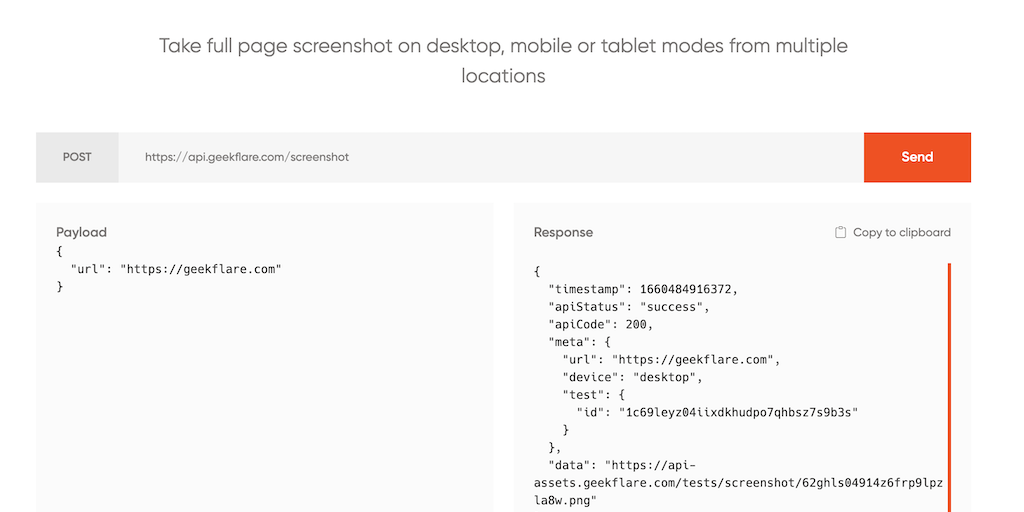 Take screenshots, Test load times, Check DNS records, Ping IPs, Audit security for your site, Run Lighthouse and a lot more with Geekflare APIs.