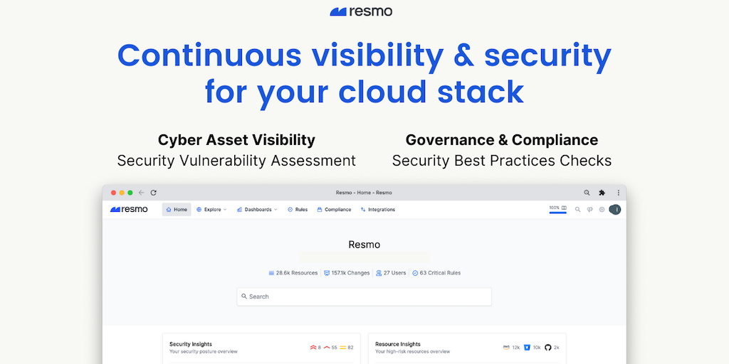 Resmo is a continuous asset visibility, security, and compliance solution for cloud and SaaS. Integrate with your tools to start querying and securing your resources. Monitor them in one place, run se