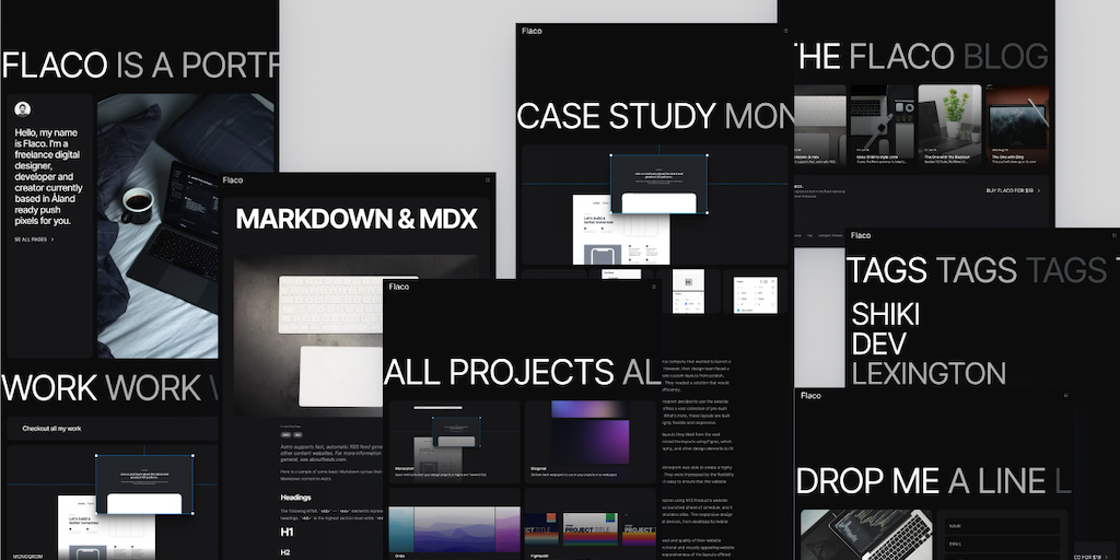 Meet Flaco, an Astro and Tailwind CSS and MDX powered Portfolio template with 12 demo pages to help you launch your portfolio and blog quickly and efficiently. Start selling your skills and writing yo