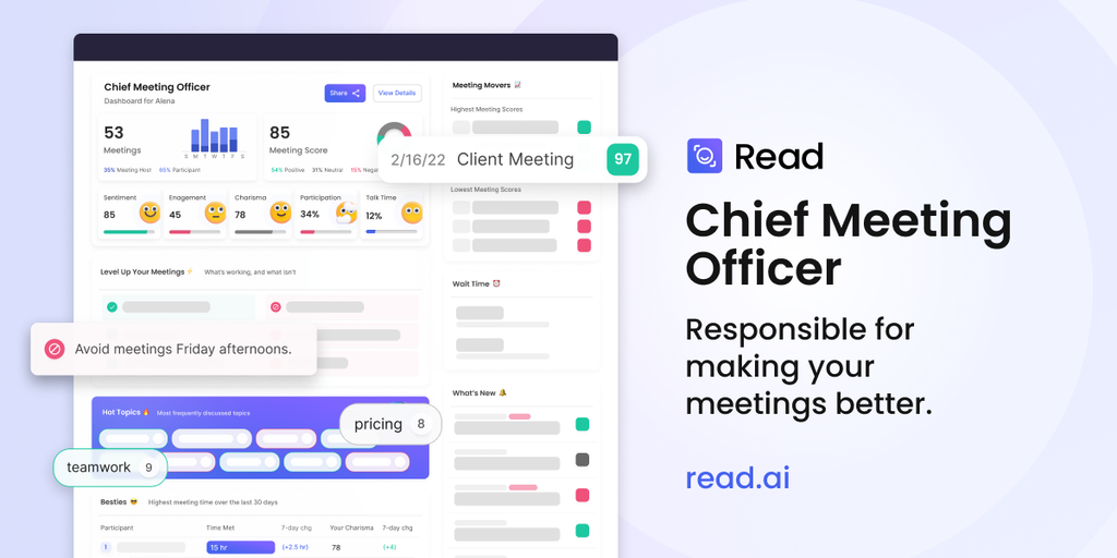 Read’s Chief Meeting Officer Suite (CMO) is Google Analytics for Meetings. CMO is responsible for making sure every meeting on your calendar matters with a team of new services including Meeting Manag