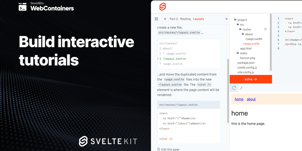 From interactive tutorials to full-blown IDEs, build instant, interactive coding experiences backed by WebContainers: the trusted, browser-based runtime from StackBlitz. Run Node.js in your browser wi